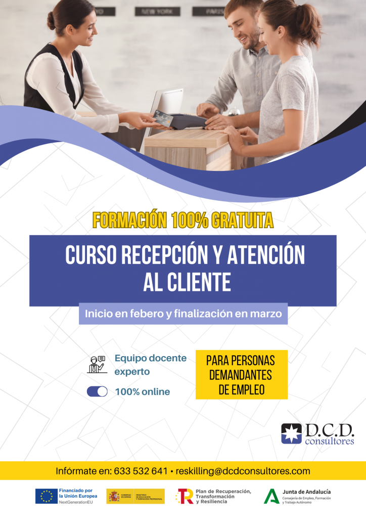 DCD Consultores, en colaboración con la Junta de Andalucía y el Plan de Recuperación, Transformación y Resiliencia de la Unión Europea, ha anunciado la apertura de inscripciones para su nuevo Curso de Recepción y Atención al Cliente. Esta formación, dirigida a personas demandantes de empleo, busca ofrecer herramientas clave para mejorar la excelencia en el servicio al cliente, un factor crucial en el éxito de cualquier empresa.
